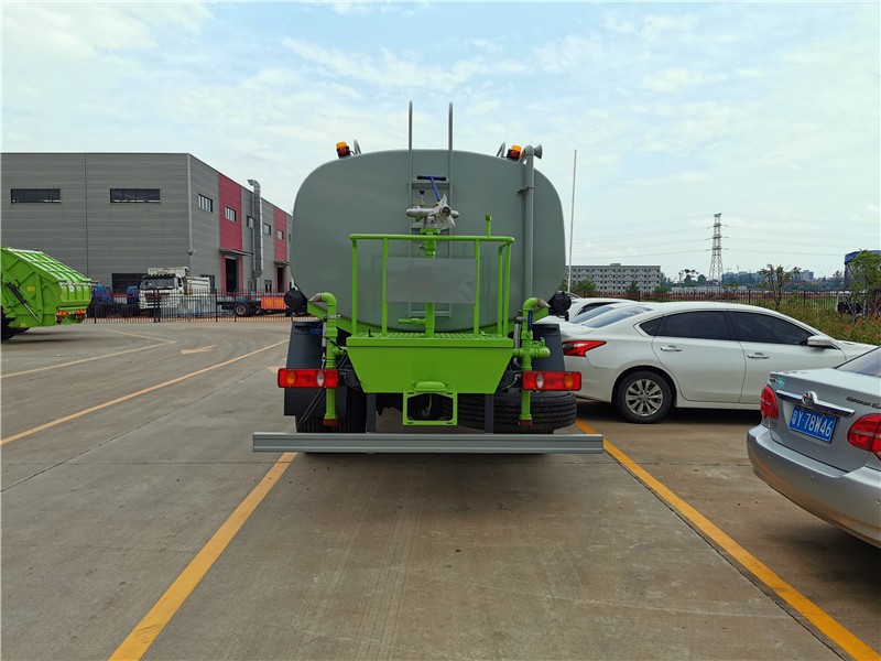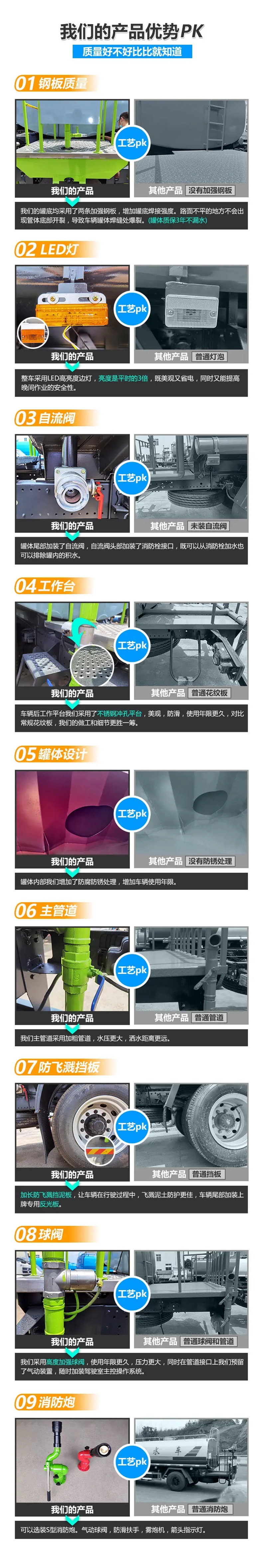 罐體采用標(biāo)準(zhǔn)Q235碳鋼制作,罐體自動(dòng)焊,裝水15噸,配大功率專(zhuān)用灑水泵,可自吸自排,前沖后灑,側(cè)噴,高位花灑,主管道加粗,大通徑球閥,直通球閥式消防接口,帶后工作沖孔平臺(tái),帶高壓炮。(可選裝大平臺(tái),可加裝30米射風(fēng)送式霧炮機(jī),可加裝前置全自動(dòng)電子高炮)。車(chē)輛環(huán)保、免征齊全,上戶無(wú)憂。