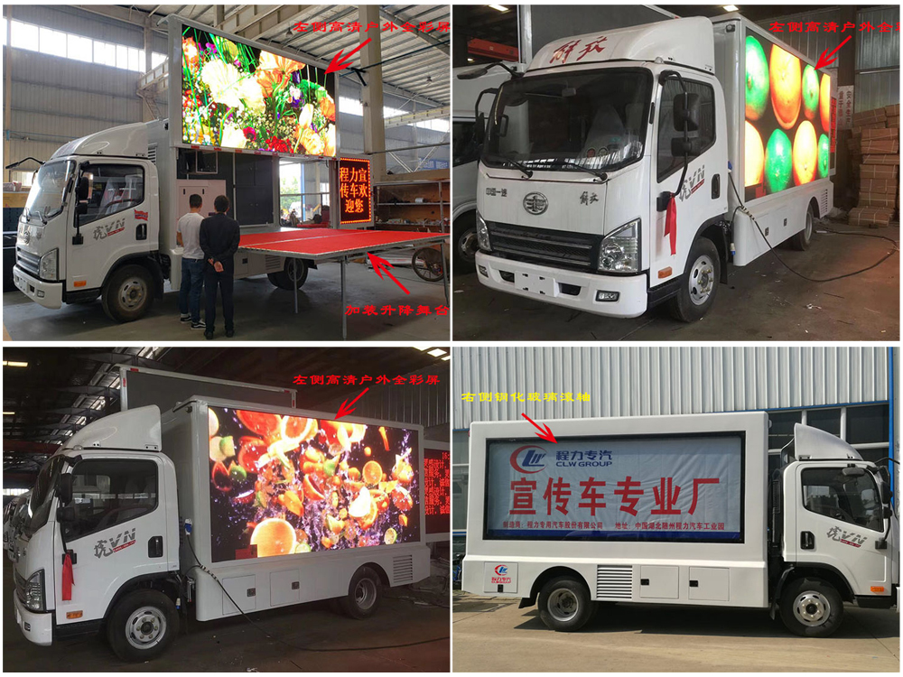 廣告車(chē)選裝配置:客戶(hù)可根據(jù)需求選裝屏幕清晰度(P10彩屏、P8彩屏、P6彩屏、P5彩屏、P4彩屏)、單面彩屏、雙面彩屏、雙面